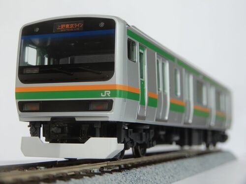 先日発売された、TOMIXのHOE231系1000番台上野東京ライン・国府津車両センターの基本セットA、増結セット、基本セットBの15両編成が入線しましたので、お伝えします。 1号車クハE230 正面。基本的にはNゲージを大きくしたように感じますが、スカートの支柱も…